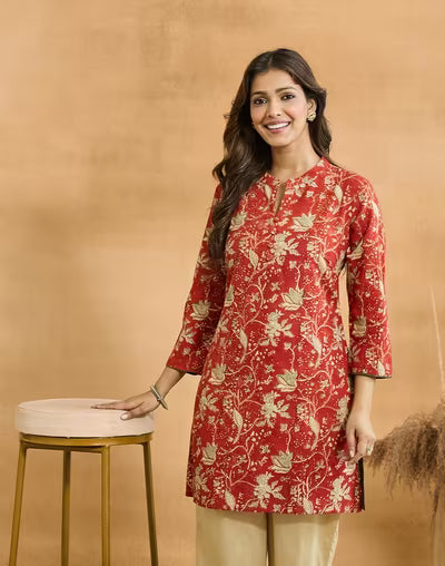 Orange Cotton Bagru Printed Slim Fit Short Kurta